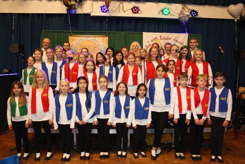 Zu Beginn stellten sich 32 Chorkinder und die Erwachsenen des Chorensembles im festlich geschmückten Saal für ein Gruppenfoto auf. Danach führten die vier Moderatorinnen Viktoria, Leonie, Maria und Leana durch das Programm. Sie gaben den Besuchern wichtige Informationen über den Chor.