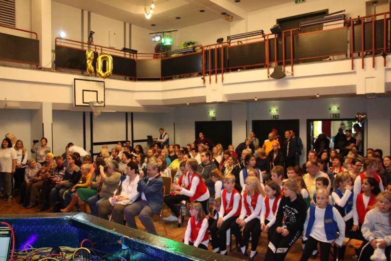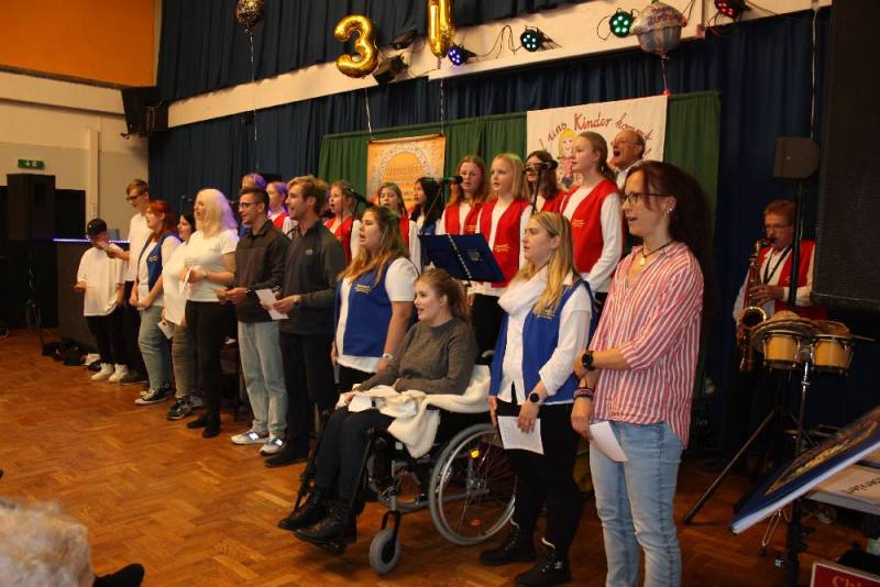 Dann kamen 10 „Ehemalige“ auf die Bühne und sangen wie in alten Zeiten das „Geburtstagslied“, den „Elefantensong“ und „Und ich stehe hier im Regen“. Beim Lied „Die Gärten der Welt“ hielten sie die acht Garten-Schilder hoch. Nach der Ausgabe der fünf Hauptpreise der Tombola, darunter ein großer Teddy für einen kleinen Jungen, wurde „Macarena“ und weitere gesellige Tänze getanzt.