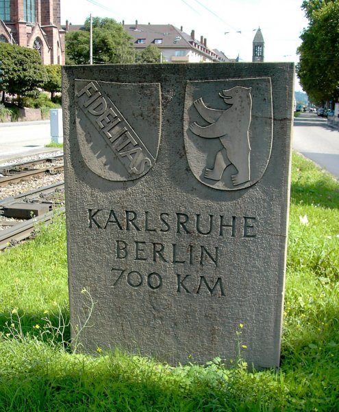 Der Karlsruher Gedenkstein für Berlin steht seit 1961 an der Durlacher Allee: Am 4. November 1959 schlug der Bund der Berliner und Freunde Berlins, Kreisverband Karlsruhe, dem damaligen Oberbürgermeister Günther Klotz – zugleich auch Schirmherr des Kuratoriums unteilbares Deutschland – vor, einen Gedenkstein für Berlin aufzustellen. Bereits am nächsten Tag antwortet Klotz, dass er diesen Vorschlag „dem Gemeinderat in seiner nächsten Sitzung positiv unterbreiten“ wolle. Am 14. Juli 1960 billigte der Kulturausschuss den vom Oberbürgermeister vorgeschlagenen Standort für den Gedenkstein am Durlacher Tor, verwirft allerdings die vom Bund der Vertriebenen angeregte Aufnahme der Ostgebiete in den Gedenkstein mit dem Hinweis auf die Straßenbenennungen in der Waldstadt. Im November 1960 beauftragte der Gemeinderat den Grötzinger Bildhauer Josef Weber mit der Herstellung des Gedenksteins, der dann am (damaligen) Tag der deutschen Einheit, am 17. Juni 1961, aufgestellt wurde.