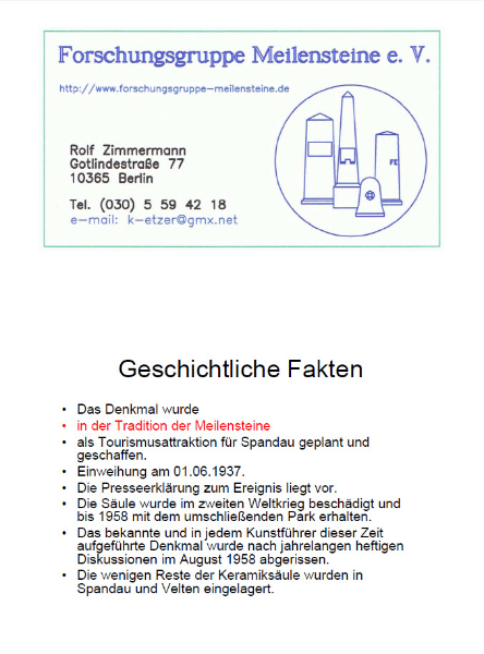 Die Keramische Verkehrssäule Spandau, als “Nachfolger“ und in der Tradition der Meilensteine steht beim Autor seit 2002 im Fokus. Seit 2012 wurden intensive Forschungen zu diesem Objekt durchgeführt, um solide aussagekräftige Fakten für einen Wiederaufbau zur Verfügung stellen zu können. Diese Informationen sind nun vorhanden.