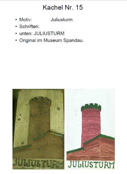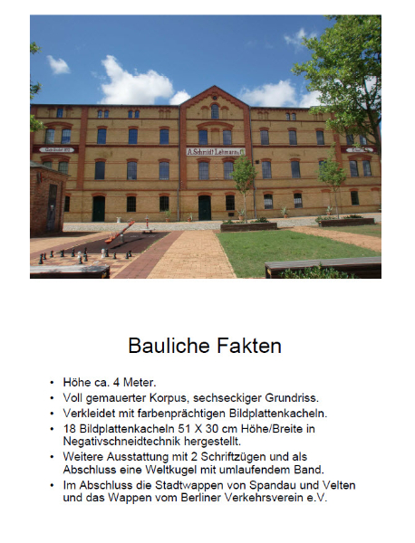 Die Säule war mit 18 farbenprächtigen plastischen Bildplattenkacheln in der Größe 50 X 30 cm versehen. Diese Kacheln zeigten Motive aus dem Havelland und der Geschichte Spandaus.