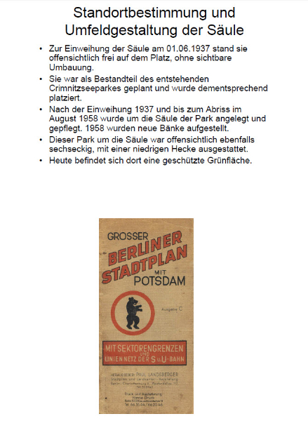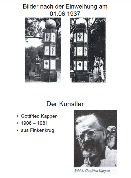 Im Frühjahr 1937 wurden alle Vorbereitungen, Planungen, Absprachen mit dem Kunstbildhauer Kappen und natürlich mit Herrn Schmidt. durchgeführt und beendet. Alles war vorbereitet, der Künstler Kappen hatte ein Modell der Säule hergestellt, der Standort in der Nähe der Einmündung der Pichelsdorfer Straße zur Heerstraße war geklärt, die Stadtobrigkeit von Spandau war begeistert und der Bürgermeister ließ sich regelmäßig über den Sachstand berichten.