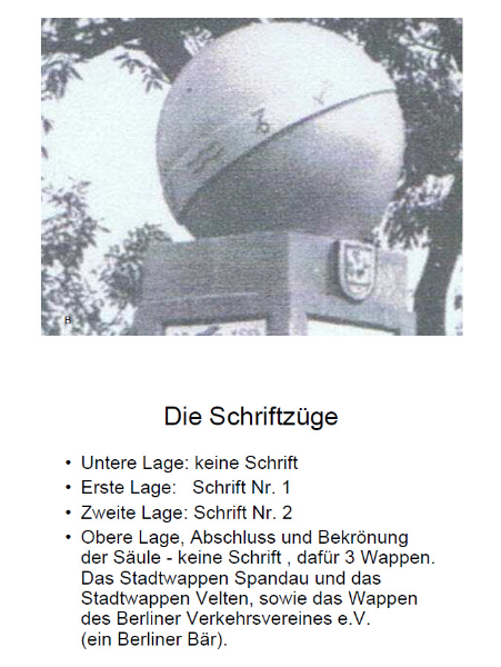 Den Abschluss der Säule bildete eine Erdkugel (70 cm Durchmesser)in der Farbe Gelb mit einem umlaufenden blauen Band mit den 12 Sternzeichen. Diese Kugel galt 1937 als Meisterleistung der Keramikherstellung. Sie wurde in einem Stück aus ca. 2 qm Ton hergestellt und war „kugelrund“ ohne Fehler. Um die Säule wurde 1937 eine Grünanlage angelegt. Die sechseckige Form wurde übernommen, es wurden Sitzbänke aufgestellt und entsprechende Hecken angepflanzt und gepflegt. Dieses einmalige und einzigartige Denkmal der Verkehrswerbung in Berlin wurde in den folgenden Jahren in allen Fremdenführern, Denkmallisten und Aufzählungen von Sehenswürdigkeiten in Berlin verewigt.