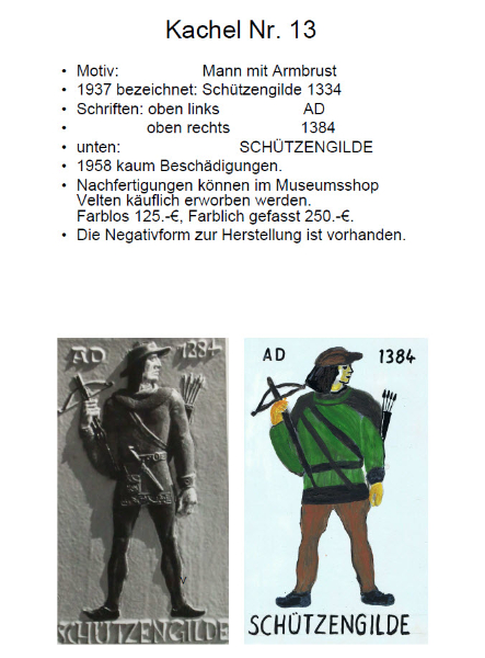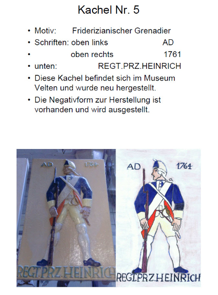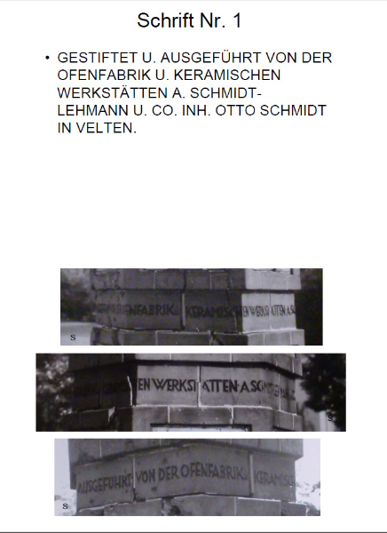 - Untere Schrift:“ GESTIFTET U.AUSGEFÜHRT VON DER OFENFABRIK U. KERAMISCHEM WERKSTÄTTEN A. SCHIDT-LEHMANN U.CO.INH.OTTO SCHMIDT IN VELTEN.“