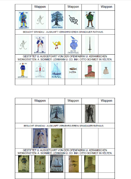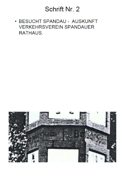 - Obere Schrift:“ BESUCHT SPANDAU – AUSKUNFT VERKERHRSVEREIN SPANDAU RATHAUS“