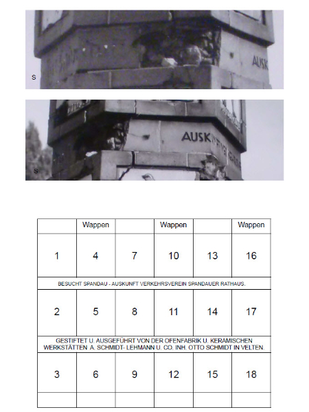 Welche Teile der Verkehrssäule geborgen und eingelagert wurden ist kaum dokumentiert und völlig offen. Aus der Presse ist 1963 zu entnehmen, dass die Kugel und zwei heile Kacheln im Stadtarchiv in Spandau vorhanden seien. In einem Vermerk des Museum Spandau vom 06.8.1980 zur Suche nach diesen Teilen ist vermerkt, dass 2 Kacheln vorhanden sind. Die Kugel wird schon nicht mehr erwähnt. Die Nachforschungen zum Wiederaufbau der Verkehrssäule seit 2011 erbrachten bisher folgendes Ergebnis.