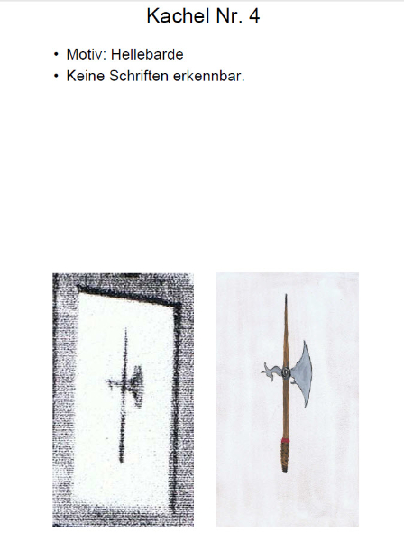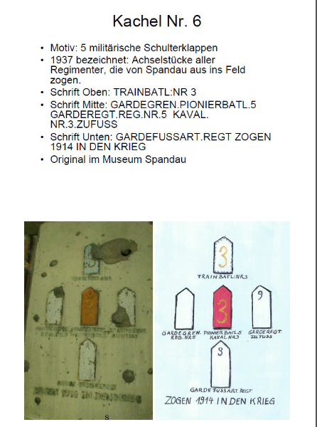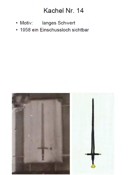 Zwischen den in 3 Ebenen angebrachten Kacheln waren umlaufend zwei Spruchbänder eingearbeitet: