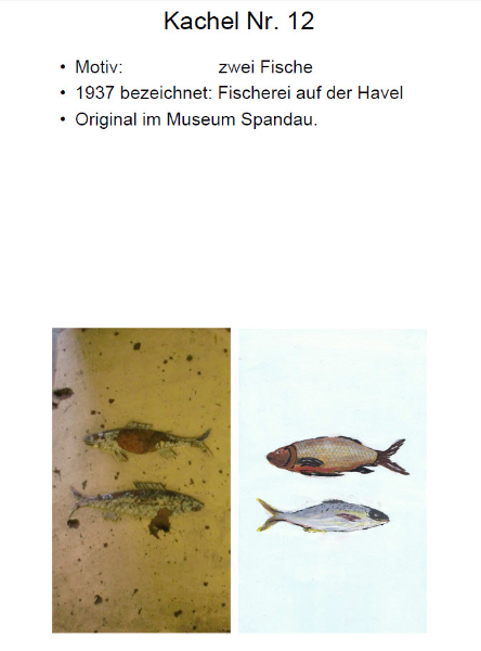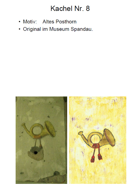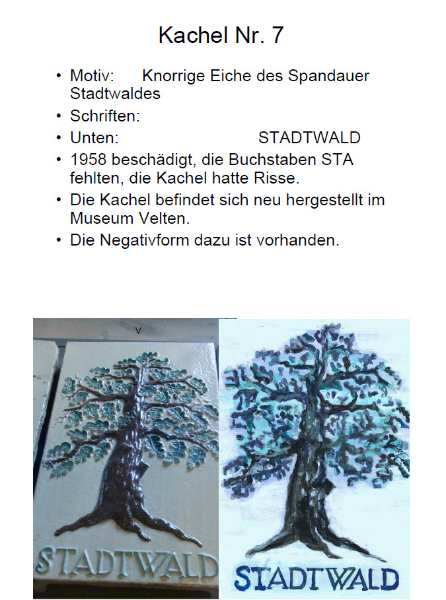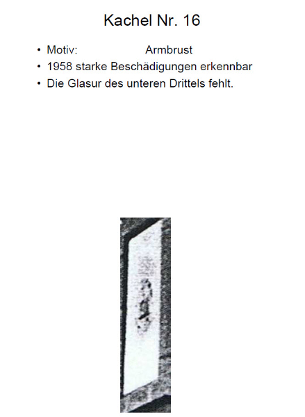Im Archiv des Stadtmuseums Spandau lagern 5 Originalplatten und zwei Verkleidungskacheln. Die Kugel ist nicht vorhanden. Im Ofen und Keramikmuseum Velten befinden sich eine Originalkachel und 3 Abgüsse von Originalkacheln.