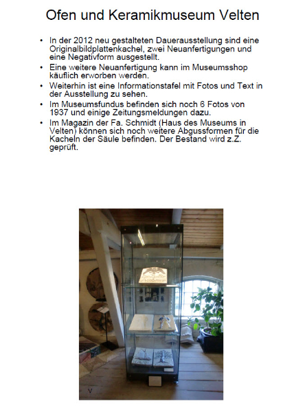 Den Auftrag dazu erhielt er vom Inhaber der Veltener Firma „Ofenfabrik und Keramische Werkstätte A. Schmidt-Lehmann und Co.“ Herrn Otto Schmidt. In dieser Produktionsstätte, welche heute auch das „Ofen- und Keramikmuseum Velten“ beherbergt, wurden die 18 Bildplattenkacheln der Säule, die 3 Wappen, die Weltkugeln mit dem umschließenden Band mit den 12 Sternzeichen und die restlichen Verkleidungskacheln hergestellt.