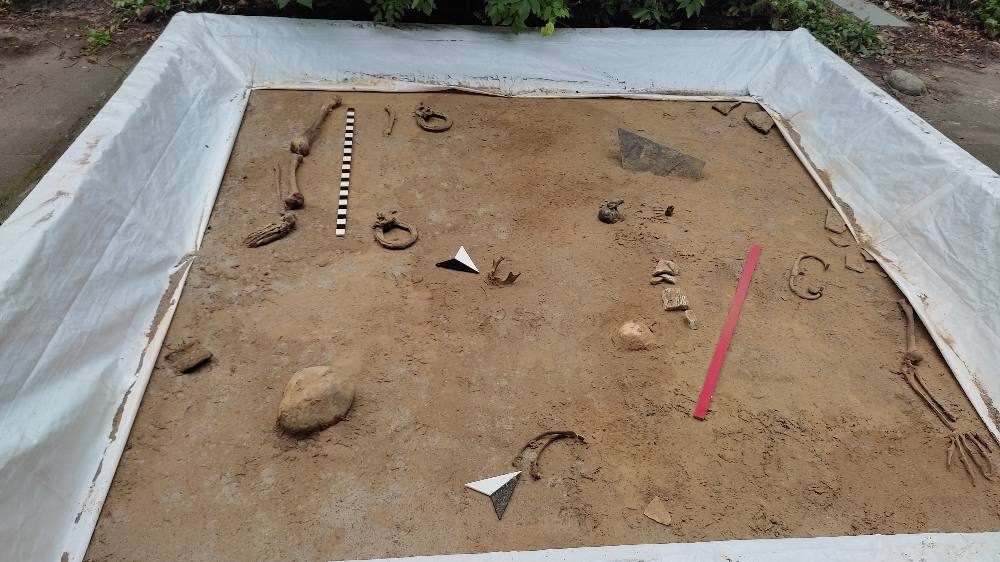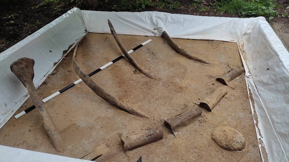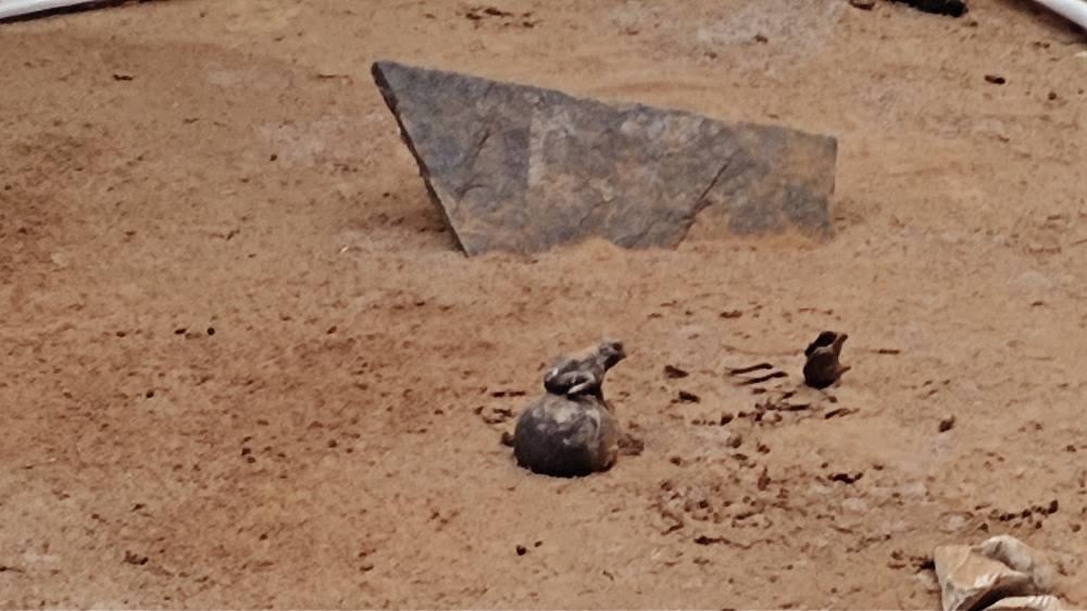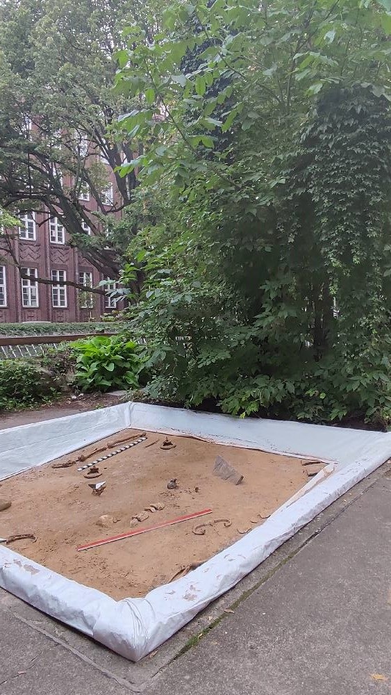 Als erstes fiel uns ein großes Plakat im Eingangsbereich auf, auf dem ein Mensch dargestellt wurde,der künstliche Körperteile trägt. Auf der linken Freifläche des Bärenzwingers ist im ehemaligen kleinen Badebecken eine historische Ausgrabungsstätte entstanden. Links oben es das Skelett eines rechten Beines mit einem Fuß, unten mittig einige Rippen, unten noch das Skelett des rechten Arms. Mit einem schwarz/weißen Pfeil ist der Unterkiefer gekennzeichnet. Auch eine künstliche Brust ist zu sehen. Um mehr über diese Menschen herauszubekommen muss man weiterforschen. Seltsamerweise war ein Frosch auf einer Kugel dabei; er lässt Raum für Spekulationen. Es ist der Blick einer anderen Spezies auf das, was von uns Menschen nach Jahrhunderten zu finden ist. Was werden Sie über uns denken und herausfinden? Werden wir Sie erstaunen und überraschen? Können Sie aus unseren Hinterlassenschaften lesen? Was wird von unserer Entwicklung von der Steinzeit bis ins Jahr 3000 übrig sein?