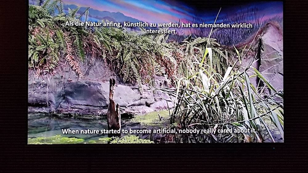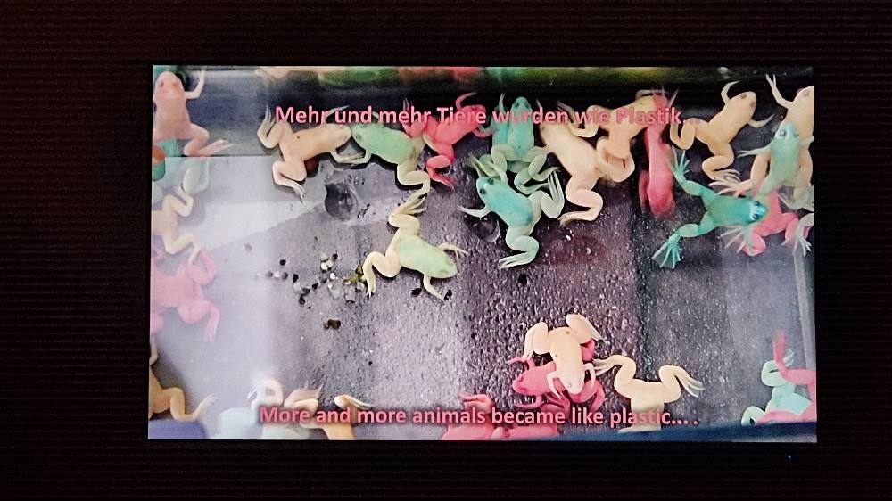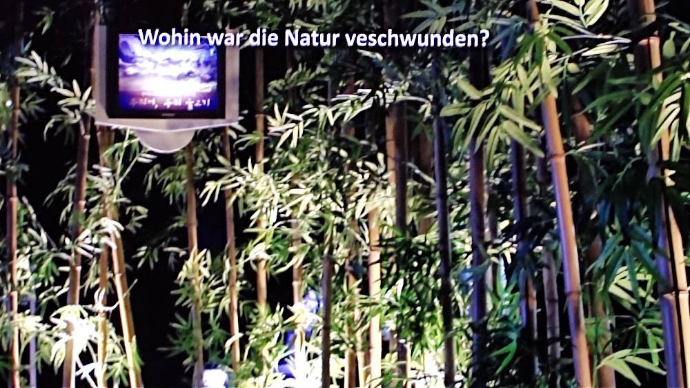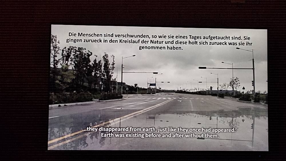 Ein Farbvideo mit einzelnen Bildern lief in Schleife und zeigte, wenn der Mensch seine Umwelt zerstört, am Beispiel von Fukushima, wie sich die Natur den Planeten zurückerobert.