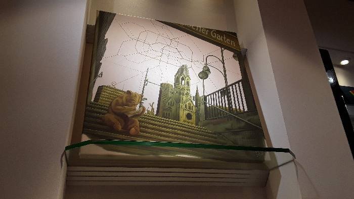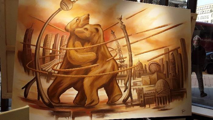 Im Schaufenster war auch das große Bild „Pas de deux“ mit dem Gendarmenmarkt im Mittelpunkt und den Berliner Bären. Er lässt viele kleine Bären an einer Fahnenstange mit der Berliner Flagge über den großen Platz schweben.