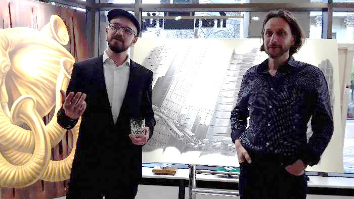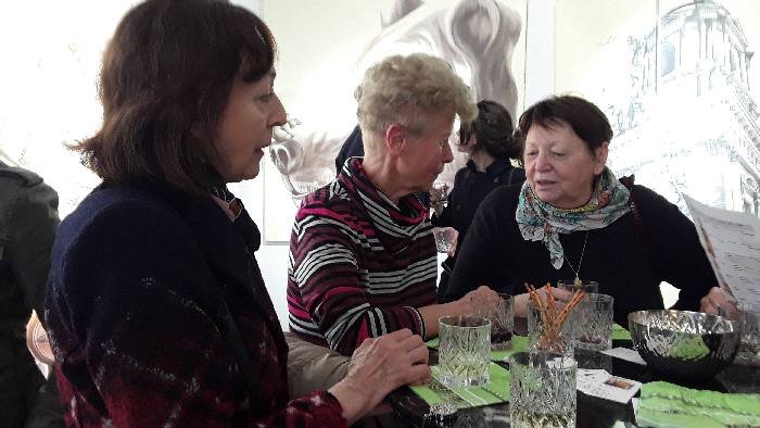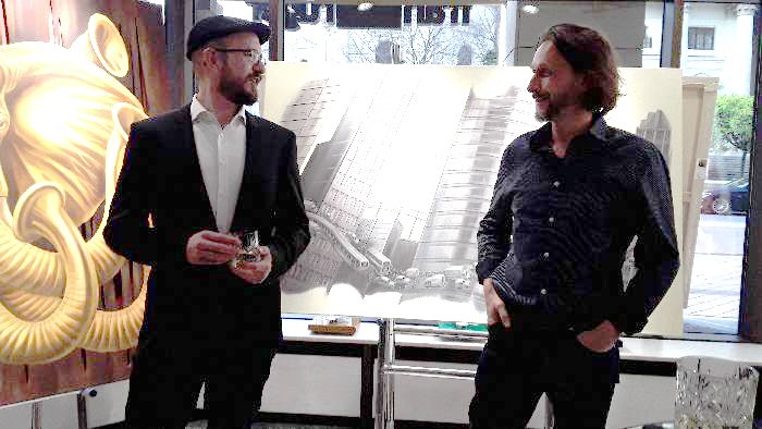 Die Bilder Uwe Tabatts und die des Künstlers Frank Krüger waren in der Galerie zu sehen, an Stehtischen kam man ins Gespräch. Es war eng, aber gemütlich. Herr Tabatt begrüßte mich herzlich und er stellte mich und unseren Verein Paul Gieselherr vor.