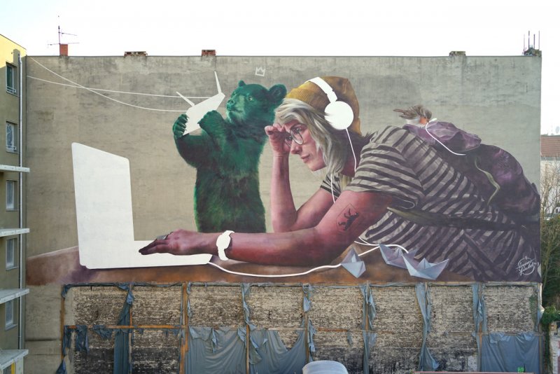 Die Künstlergruppe innerfields wurde mit der Umsetzung des Murals in der Nordbahnstraße beauftragt. Innerfields haben sich bei dem Motiv stark vom Umfeld inspirieren lassen und sich mit dem eingekapselten Leben der eifrig lernenden Studenten beschäftigt. Sie haben mit ihrem Stil und der Bildkomposition das studentische Leben in Berlin kreativ transportiert. In der Bildsprache wird deutlich dieser Bezug hergestellt und lässt trotzdem Platz für Interpretation. Das hat überzeugt.