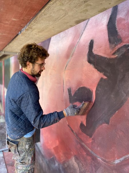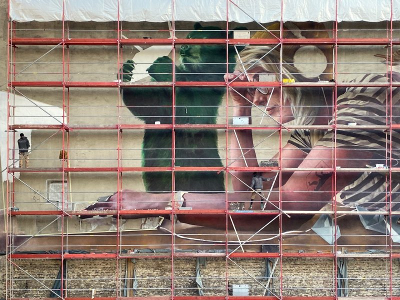 Die Arbeitszeit für das Mural betrug zu zweit sieben Arbeitstage und für 300qm Wandbild haben innerfields 20 Sprühdosen und15 Liter Farbe verbraucht. Eine Woche dauerte der Auf- und Abbau des Gerüstes.