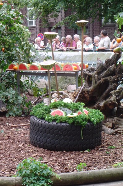 Maxi beschäftigt sich auch mit Futter, das nicht auf Anhieb fressbar erscheint, wie Kokosnüsse und Straußeneier. Das ist für Schnute uninteressant, sie kullert die Kokosnuss nur eine Weile hin und her. Wenn sie nicht beim Drauftreten kaputt geht, kann man sie auch nicht fressen! Ihre bevorzugten Leckereien sind Räucherfisch, Ananas und Hundefutter (Feuchtfutter).