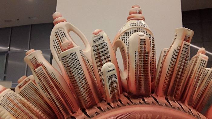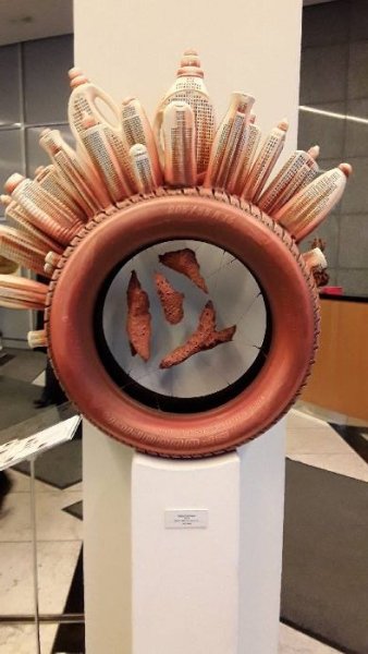 Das Kunstobjekt „Waschstraße“ sieht sehr futuristisch aus. Beim näheren Hinsehen entpuppten sich die Häuser auf dem Reifen als Kunststoffflaschen in denen sich ehemals Reinigungsmittel befanden. Was für eine geniale Idee? Auch ein alter Reifen wurde so recycelt.