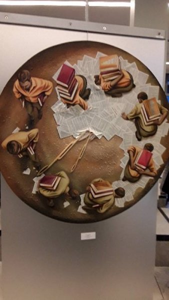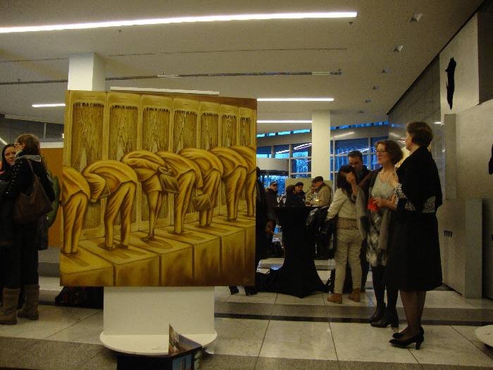 Auch beim genauen Hinsehen auf das Bild „Profiliert“ entdeckt man wieder einiges besondere. Die Menschen stehen auf Blöcken, die wie Klaviertasten ausschauen auf den das Wort P R O F L I ER T zu lesen ist, alle gebückter Haltung in eine Zeitung schauen, die hinter einen Fadengeflecht verschwindet. Es war schon interessant, dass viele Besucher in der gleicher Haltung vor dem Bild standen, um den Titel zu lesen.
