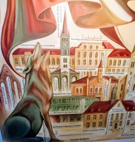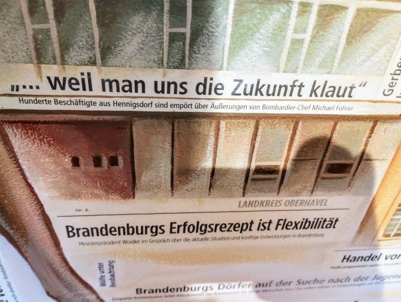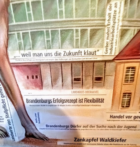 Neben den historischen Wurzeln der Region thematisierte Uwe Tabatt in sehr unterschiedlicher Weise bildlich, allegorisch und mit Schriftzügen an Zeitungsüberschriften erinnernd vergangene wie aktuelle regionale Fragen und Probleme, aber auch bereits erfolgte Lösungswege und neue Visionen.
